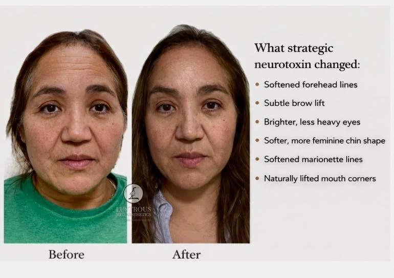 Neurotoxin treatments are designed to soften dynamic lines and reduce muscle activity that contributes to wrinkles, while maintaining natural facial movement. At Lustrous Med Aesthetics, each treatment is customized based on your individual facial anatomy and goals. A strategic approach to placement and appropriate dosing allows for results that appear balanced, refreshed, and not overdone.